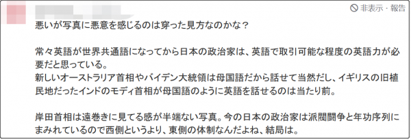 有日本網民在新聞評論區表示,這張照片充滿惡意,岸田看起來像是“被輕視了”;還有人覺得,如此畫面是因為日本政客英語水平不過關,不如要求國會議員去考語言類的資格證;還有人提議,日本中學社會課程、考試乾脆全用英文……