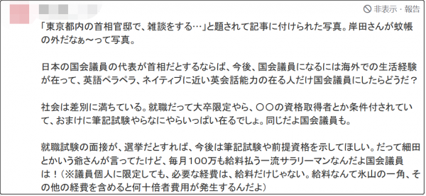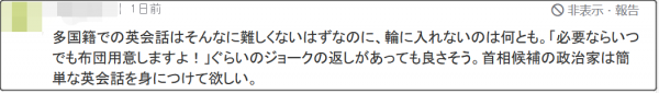 “首相作為國會議員的代表,無法融入英語圈着實令人汗顏。以後國會議員,是不是應該有個門檻,比如説必須有海外工作經驗,必須英語流利等等。別總讓我們這些社畜考這個證那個資格的,先從國會議員開始吧。”