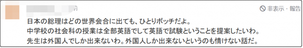 “日本的首相無論參加哪個世界會議,都是這樣一個人待着。我提議,中學社會課程全用英文,考試也用英文……”