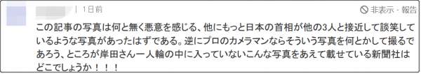 “這張照片惡意感爆炸了。現場肯定有許多岸田首相和其他領導人談笑風生的照片,為什麼單發這張照片,這麼不客觀,算什麼新聞機構?”
