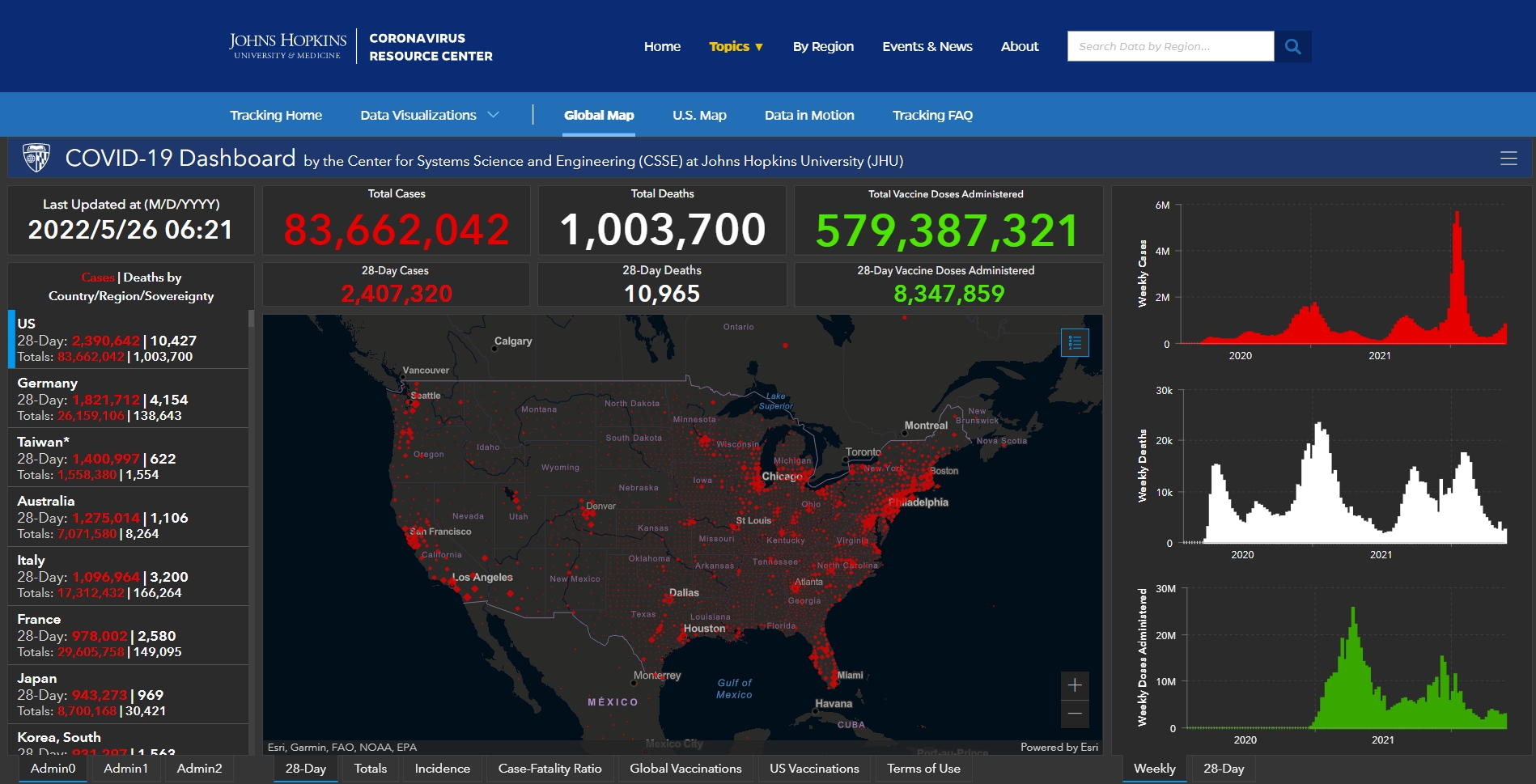 (觀察者網訊)根據美國約翰斯·霍普金斯大學統計數據,截至北京時間5月26日6時21分,美國新冠肺炎累計感染病例達到83662042例,累計死亡病例達到1003700例。在過去約24小時裏,美國新增感染病例171038例,新增死亡病例999例。