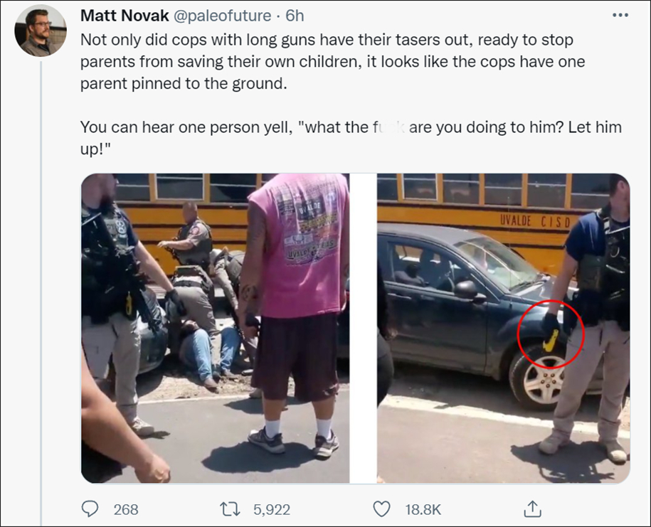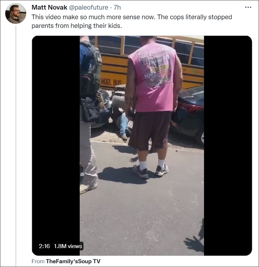隨後,諾瓦克還附上了源自社交媒體情報機構Storyful News的完整版視頻,併發推指出:帶着長槍的警察們不僅拿出了泰瑟槍,準備阻止父母們救自己的孩子,看起來警察們還把其中一位家長按倒在了地上。從視頻中可以聽到一個人大喊:“你對他做了什麼?讓他起來!”
