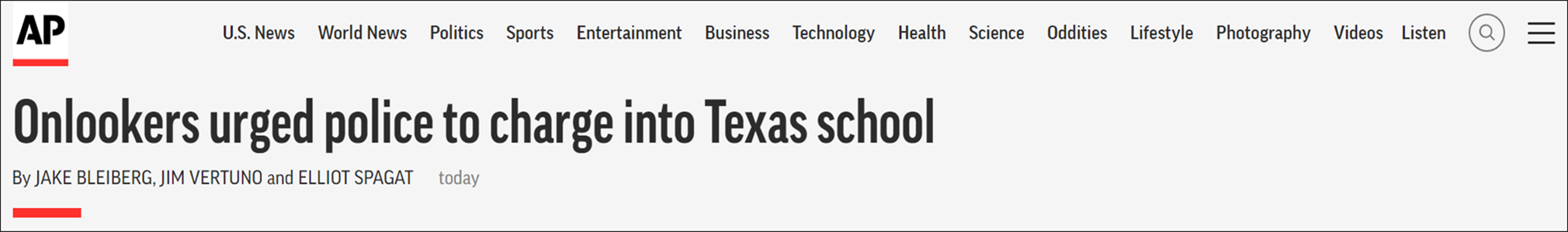 隨着案件細節不斷披露,據美媒稱,事發時現場圍觀者曾不斷敦促警方衝進學校,快速到場的遇難兒童家長也指責警察沒有儘快採取行動阻止槍手。“至少有40名警察全副武裝,但他們什麼也沒做,(直到)為時已晚。”據美媒稱,槍手在學校待了超40分鐘,然後才被執法人員擊斃。