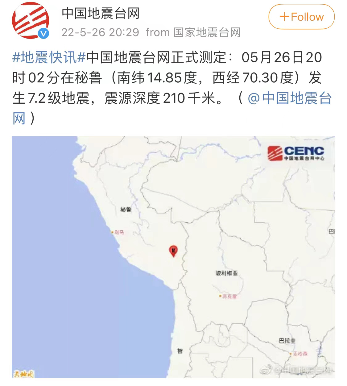 秘魯發生7.2級地震,震源深度210千米 None 2022-05-26 @中國地震台網 消息 中國地震台網正式測定:05月26日20時02分在秘魯(南緯14.85度,西經70.30度)發生7.2級地震,震源深度210千米。