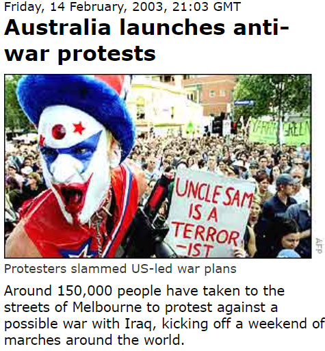 2003年,僅墨爾本就有15萬人參加反戰遊行,但這些人還不足以構成穩固的政治力量來推動變革,澳大利亞最終還是與美國站在一起,圖片來源:BBC報道截圖