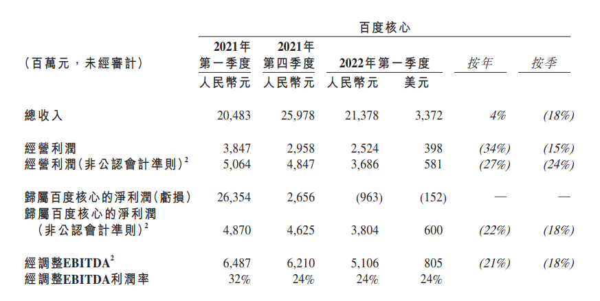 (觀察者網訊 文/盧思葉 編輯/莊怡)5月26日,百度發佈2022年第一季度未經審計的財務報告。一季度,百度實現營收284.11億元,較2021年同期微增1%;非美國通用會計準則下的淨利潤為38.79億元,同比下降10%。