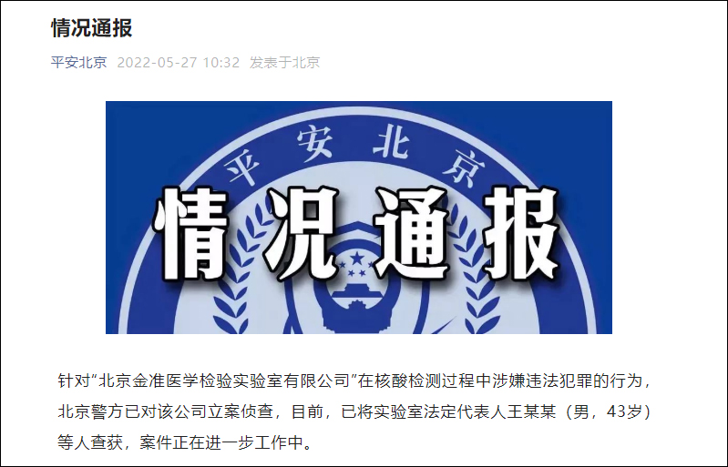 在核酸檢測過程中涉嫌違法犯罪,北京金準醫學檢驗實驗室有限公司被立案偵查