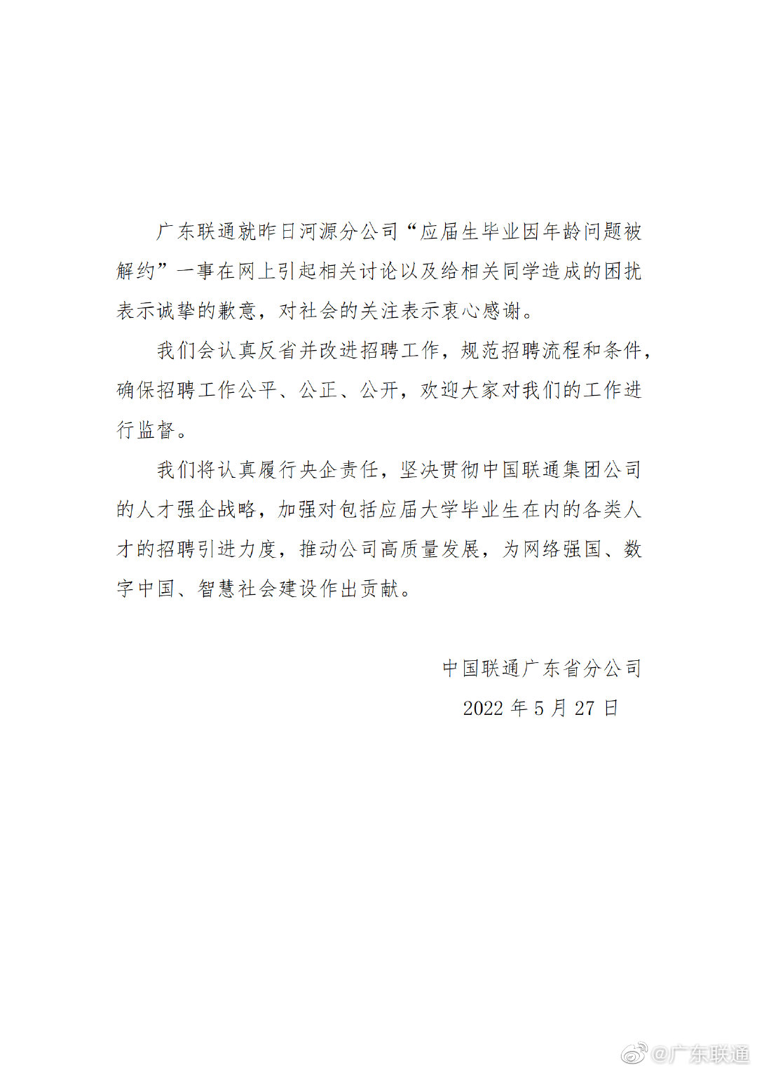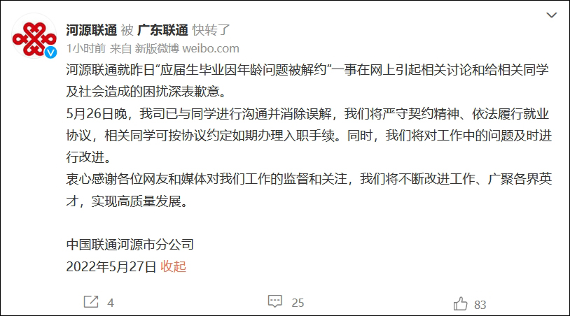 今天(27日)中午,@河源聯通就“應屆生畢業因年齡問題被解約”一事發文致歉,表示已於5月26日晚與相關同學進行溝通並消除誤解,將嚴守契約精神、依法履行就業協議,**相關同學可按協議約定如期辦理入職手續。**同時,公司將對工作中的問題及時進行改進。
