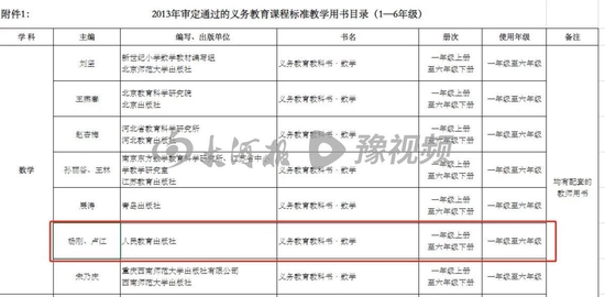 2013年5月6日,教育部辦公廳發佈《教育部辦公廳關於2013年中小學教學用書有關事項的通知》,《通知》稱第二批義務教育階段教材的修訂、審定工作已基本完成。在該《通知》的附件中,關於《2013年審定通過的義務教育課程標準教學用書目錄(1—6年級)》表格顯示,由楊剛、盧江主編,人教社出版的小學數學教材(1—6年級)也在其中。