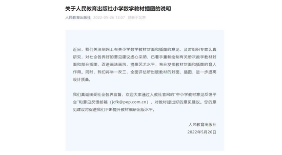 同時,5月26日,人民教育出版社做出最新回應:對社會各界好的意見建議虛心採納,已着手重新繪製有關冊次數學教材封面和部分插圖,改進畫法畫風,提高藝術水平,充分發揮教材封面和插圖的育人作用。