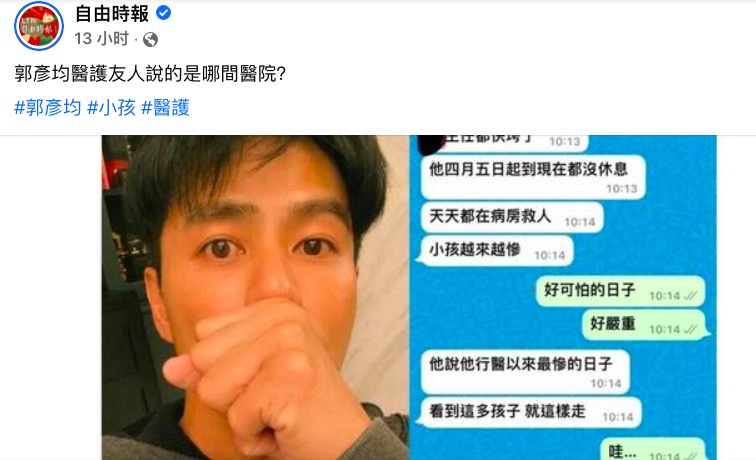 截圖顯示,其友人稱一位醫院主任1個多月來都沒休息,天天在病房救人,看到“小孩越來越慘”,“他説他行醫以來最慘的日子,看到這(麼)多孩子就這樣走(了)”。該友人希望郭彥均能借此呼籲“大家對醫護多一點尊重,少一點謾罵”,“病人太多,他們也快撐不住”。