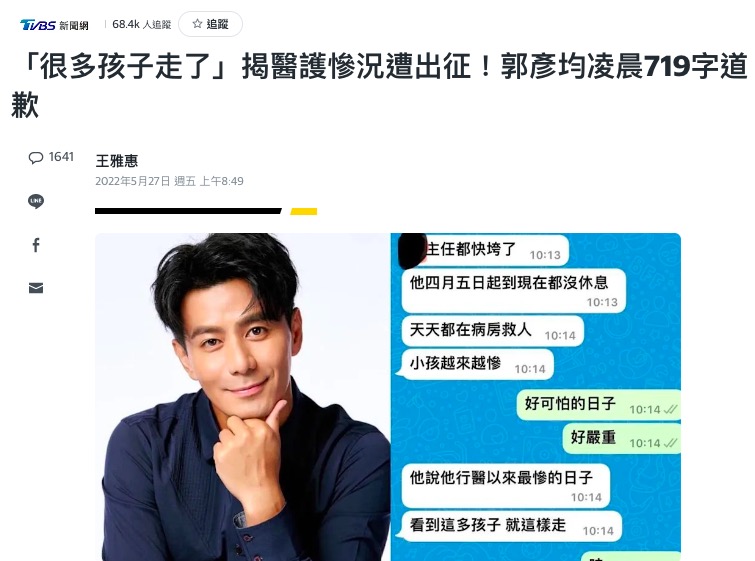 5月25日,曾參演偶像劇《真命天女》《籃球火》,並曾赴內地錄製過綜藝《奔跑吧兄弟》的台灣藝人郭彥均在臉書發文,曬出與醫護友人的對話截圖。