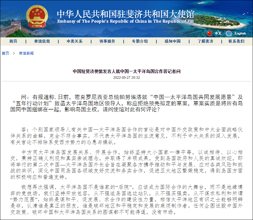 據中國駐斐濟大使館網站5月27日消息,中國駐斐濟使館發言人就中國—太平洋島國合作答記者問。