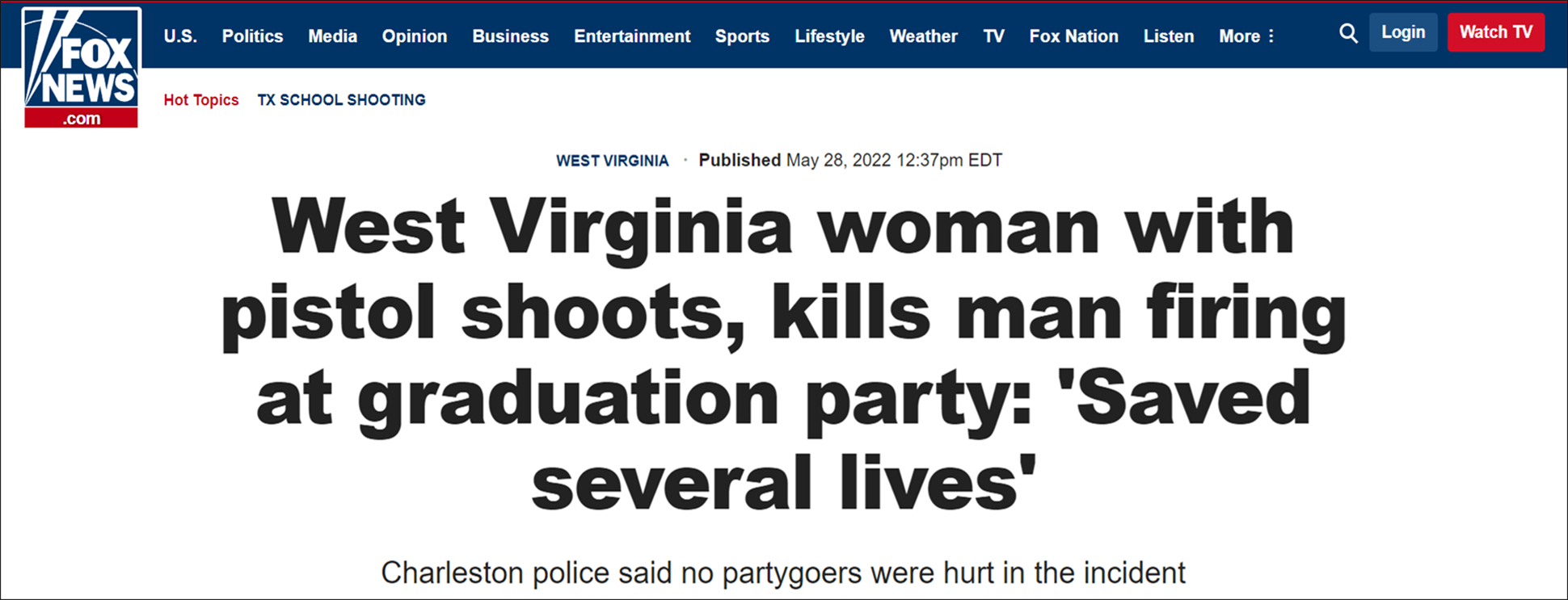 “這位女士攜帶合法槍支,是一位守法的公民,她阻止了可能導致20-30人死亡的威脅。她直面了威脅並阻止了它。她沒有逃避威脅。她採取了行動,防止了查爾斯頓的大規模傷亡。”