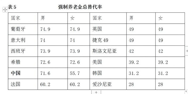 發達國家的男女替代率相同是因為退休年齡相同,而中國女工退休較早;加上中國退休年齡也早,按同比口徑,中國職工養老金替代率不低於中等發達國家。