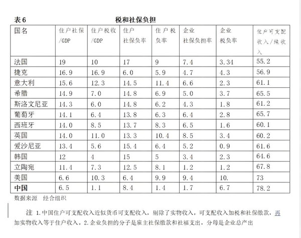 企業社會負擔包括納税、繳納社保、支出社會福利(醫療二次報銷、養老補貼等等)。企業淨繳税與總產出的比,中國為6.7%,中等發達國家為2.3%;企業繳納社保和社福支出與總產出的比,中國約1.7%;中等發達國家為5.5%(其中企業社保繳納為4.6%、社福為1.1%)。