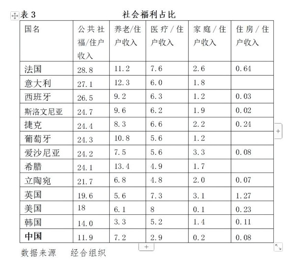 數據顯示,住户公共福利與住户收入的比,中國約12%,比中等發達國家約低11個百分點,養老、醫療、家庭、住房與住户收入的比也低於中等發達國家,但各有差異。