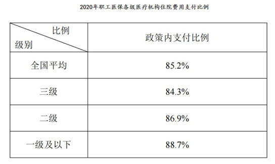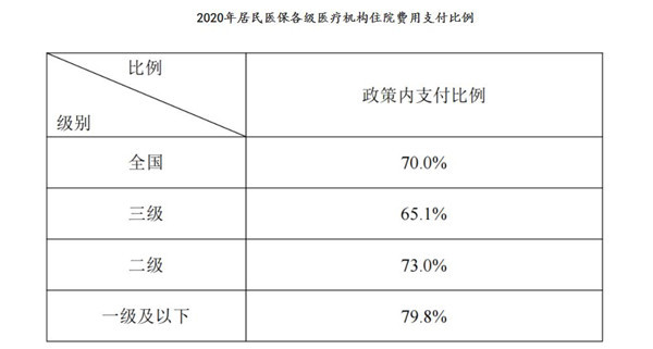 從2020年起,不再公佈實際報銷率(2019年,職工醫保住院實際報銷率平均為75.6%,居民醫保住院實際報銷率平均為60%)。2020年,職工醫保住院政策內報銷率平均在85.2%,居民醫保住院政策內報銷率平均在70%。