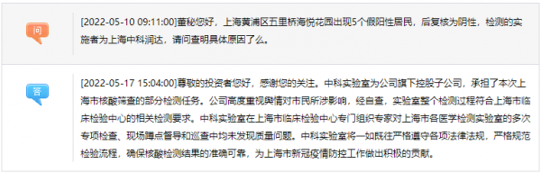 隨後該公司又在投資互動平台表示,“經自查,實驗室整個檢測過程符合上海市臨牀檢驗中心的相關檢測要求。中科實驗室在上海市臨牀檢驗中心專門組織專家對上海市各醫學檢測實驗室的多次專項檢查、現場蹲點督導和巡查中均未發現質量問題。”