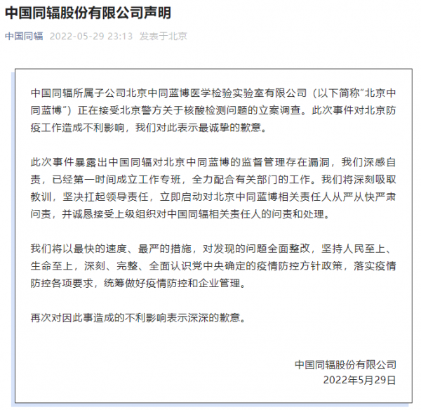隨後當日晚間23點,作為北京中同藍博的母公司,中國同輻在其官方微公號發表致歉聲明,“此次事件對北京防疫工作造成不利影響,我們對此表示最誠摯的歉意。我們深感自責,已經第一時間成立工作專班,全力配合有關部門的工作。”