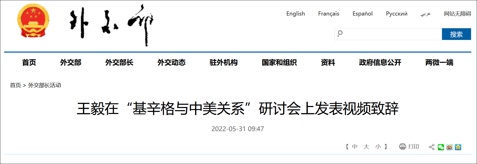 據外交部網站消息,2022年5月31日,國務委員兼外長王毅應邀在“基辛格與中美關係”研討會上發表視頻致辭。