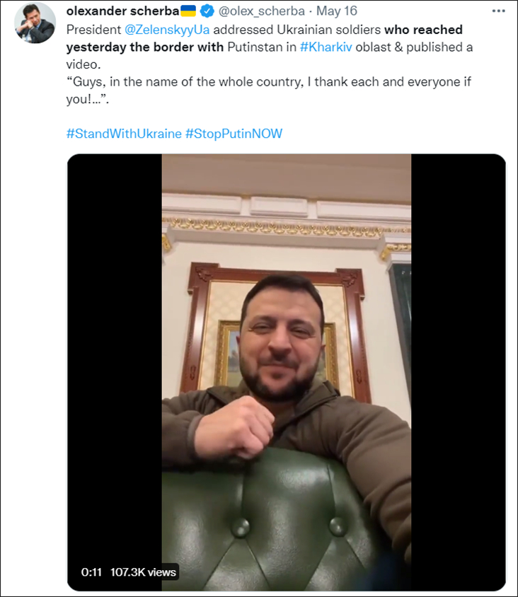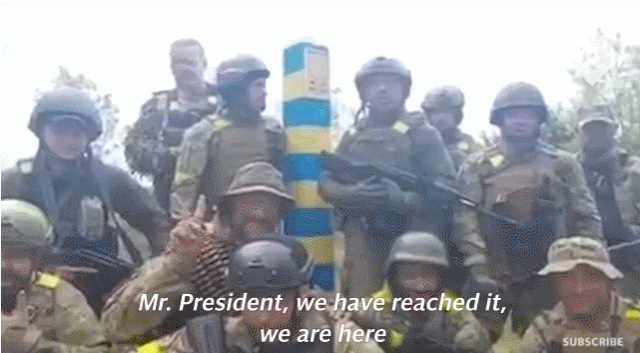 在視頻中,大約12名烏軍士兵圍繞着一個塗着烏克蘭國旗顏色的界碑合影,其中一人向澤連斯基報告稱:“今天,5月15日,烏克蘭第127防衞旅第227營已到達俄羅斯邊界。總統先生,我們已經做到了,我們正在邊境上……”