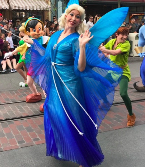 在世界各地的迪士尼主題樂園裏,真人扮演的藍仙女多與1940年動畫版造型相仿。