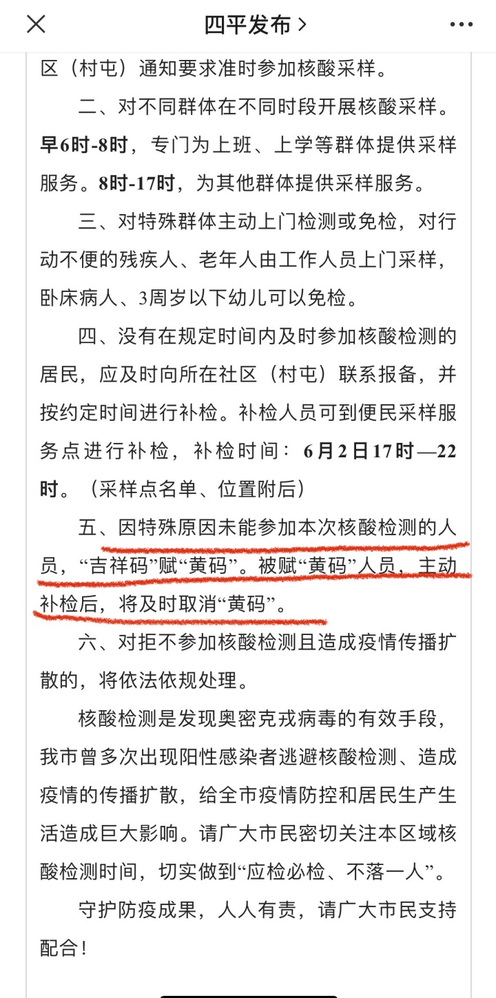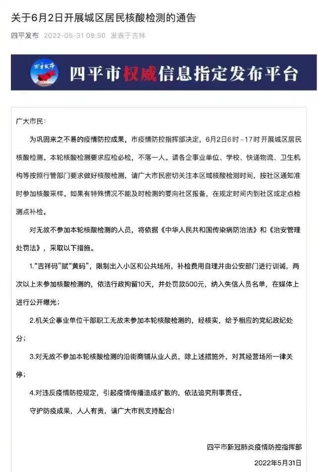 2022年5月31日上午,吉林省四平市發佈《關於6月2日開展城區居民核酸檢測的通告》,要求對於兩次以上未參加核酸檢測者,依法行政拘留10天,並處罰款500元,納入失信人員名單,在媒體上進行公開曝光。此消息一經公佈,隨即衝上了熱搜。