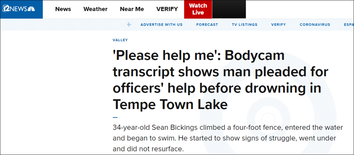 據亞利桑那州本地電視台“12 News”(即KPNX)5日報道,3日,該州馬里科帕縣坦佩市(Tempe)公佈了一段警方隨身攝像機拍下的視頻,視頻顯示了一名無家可歸的男子在試圖躲避警察後,在坦佩鎮湖(Tempe Town Lake)溺水身亡的事件。