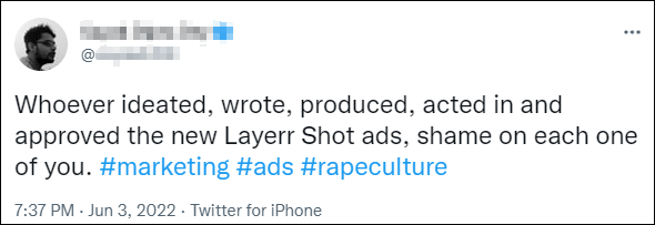 另一位推特用户寫道:“無論是誰構思、撰寫、製作、參與並批准了新的Layer’r Shot廣告,你們每個人都真可恥。”
