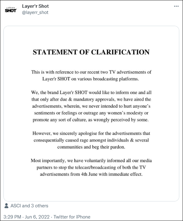 對此,這一男性身體噴霧品牌Layer’r Shot在6日為爭議廣告道歉,並表示已主動要求所有媒體合作伙伴從4日起立即停止播放這兩條廣告。此前,印度信息與廣播部在4日也致信推特和YouTube平台,要求撤下這兩條廣告。