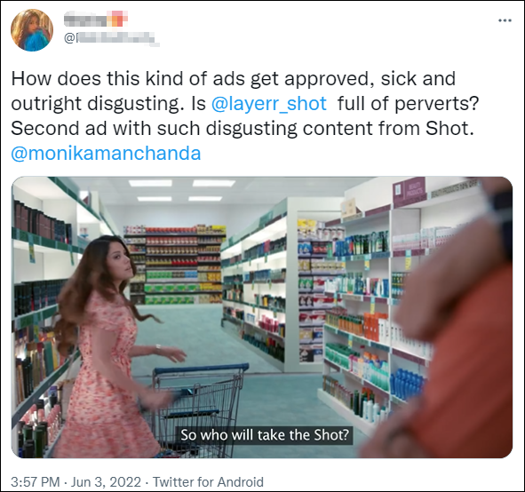 一名網民在推特上質問:“這種廣告是如何被批准的?病態,令人噁心。Layer’r Shot裏充滿了變態嗎?這是Layer’r Shot第二個內容如此噁心的廣告。”