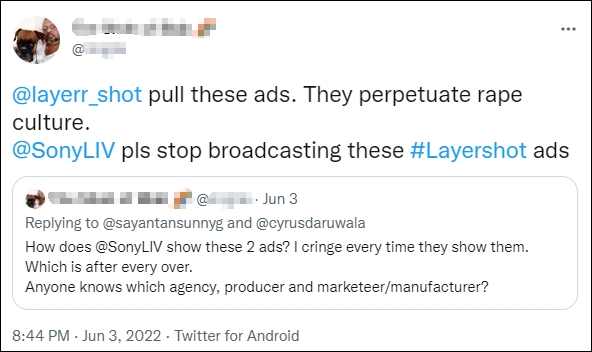 還有人直指這就是在“宣傳強姦文化”:“Layer’r Shot放出這些廣告,他們延續了強姦文化。SonyLIV(印度流媒體平台)請停止播放這些Layer’r Shot的廣告。”