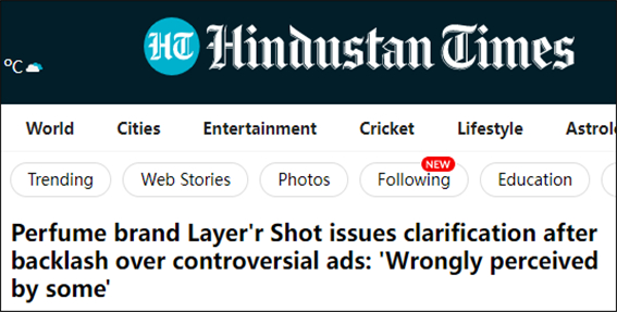 早在6月4日,印度新德里電視台(NDTV)就報道稱,當天,男性身體噴霧品牌Layer’r Shot的兩條廣告受到了社交媒體用户的抨擊,批評其“宣傳強姦”。