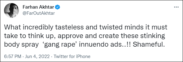 印度男演員、製片人和導演法拉汗·阿克塔爾(Farhan Akhtar)4日在推特上炮轟道:“想出、批准和製作這些臭氣熏天的身體噴霧“輪姦”影射廣告,需要多麼令人難以置信的低俗品味和扭曲的頭腦……!!可恥。”