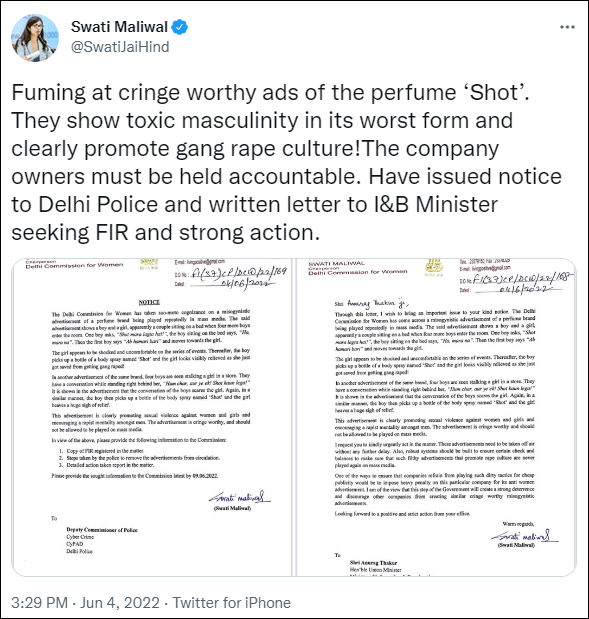 這些廣告也引起德里婦女委員會主席斯瓦蒂·馬利瓦爾(Swati Maliwal)的注意,4日,馬利瓦爾發推表示她已致信印度信息與廣播部、德里警方等。她還表示自己對Layer’r Shot的廣告感到憤怒,並批評稱:“他們以最惡劣的形式展示了有毒的男子氣概,顯然宣傳了輪姦文化!必須追究公司所有者的責任。我已向德里警方發出通知,並寫信給信息與廣播部部長,尋求第一信息報告(FIR,印度警察接獲罪案後的初步蒐證文件)和採取嚴厲行動。”