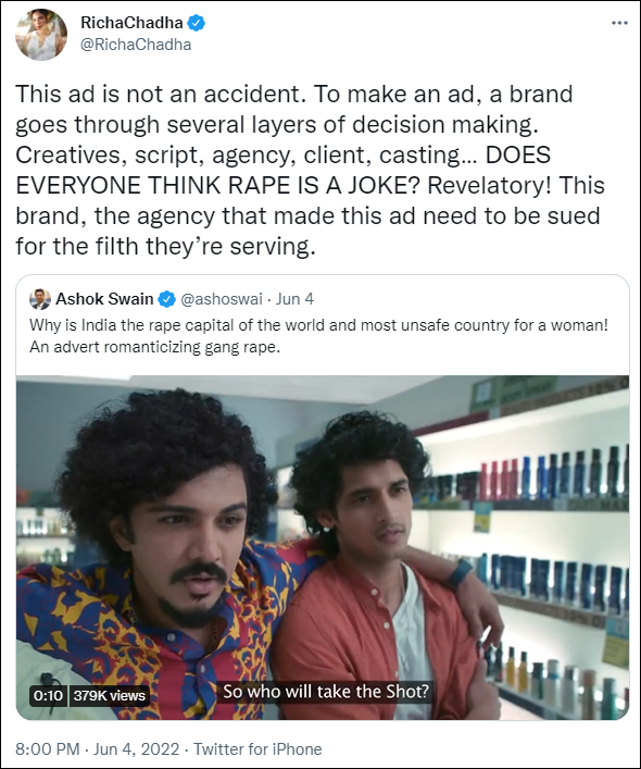 印度女演員瑞恰·查達(Richa Chadha)4日也發推抨擊道:“這則廣告並非一個意外。一個品牌要做一個廣告,要經過幾個層次的決策。創意、劇本、經紀公司、客户、演員……難道每個人都認為強姦是個笑話嗎?這個品牌,製作這個廣告的機構應該因他們提供的骯髒東西被起訴。”