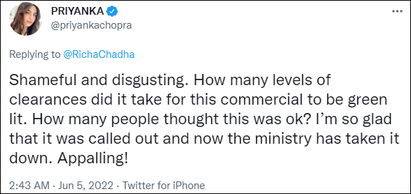 印度女演員佩麗冉卡·曹帕拉(Priyanka Chopra)在推特上回應了查達的推文,“可恥、噁心。這個廣告要經過多少級的許可才能被批准。有多少人認為這是可以接受的?我很高興它被公開指出,並且被信息與廣播部刪除了。真是駭人聽聞!”