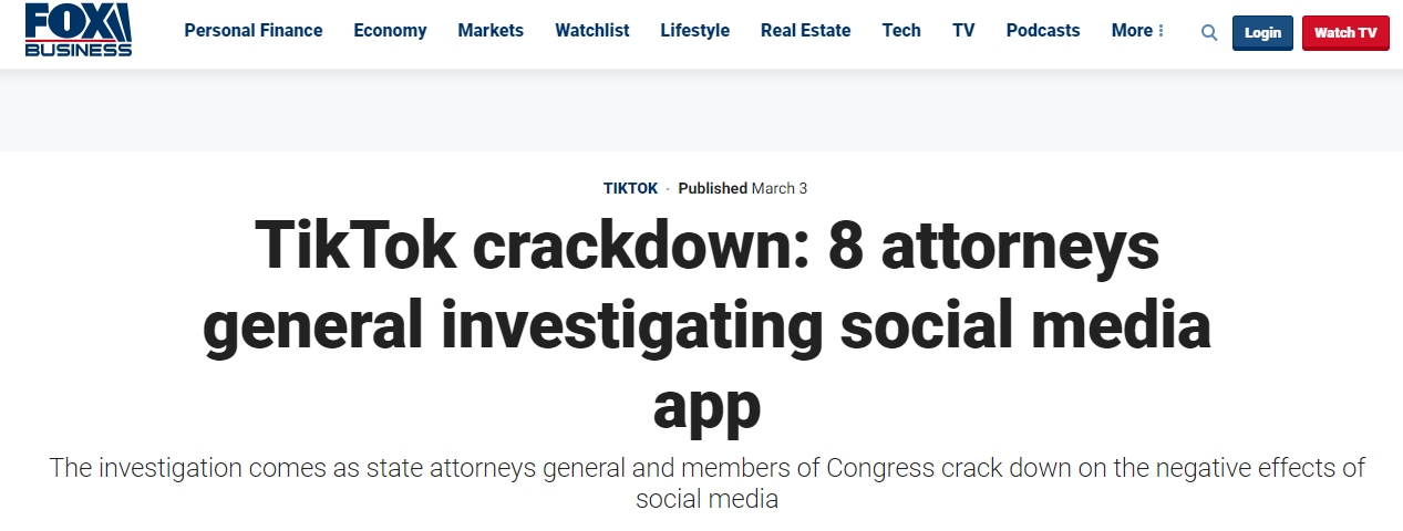 今年3月,包括加利福尼亞州和馬薩諸塞州在內的美國八個州宣佈,他們已經在全國範圍內對中國字節跳動旗下TikTok發起了一項兩黨聯合調查,重點是調查TikTok是否對年輕人的身體或心理健康造成傷害。