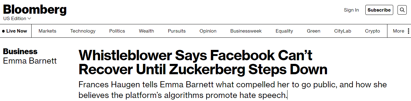 豪根表示,臉書的算法推動了仇恨等言論的蔓延,並將青少年等用户羣體導向有害內容。有證據顯示,該公司對其產品可能會帶來的風險心知肚明,但是他們卻沒有與之適配的應對措施。Meta如果想要恢復元氣,那麼其掌舵人扎克伯格必須下台。