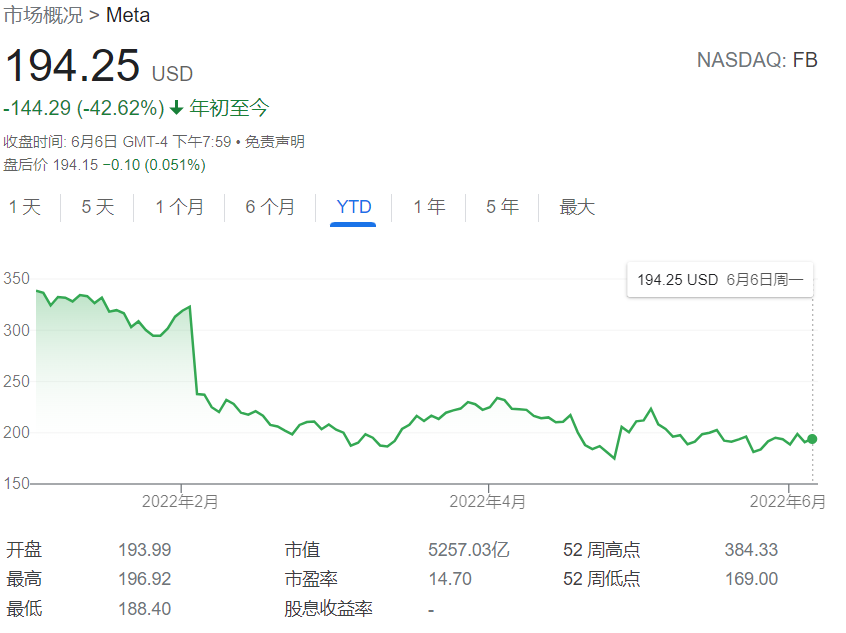 昨日收盤,Meta股價收報194.25美元 谷歌財經截圖