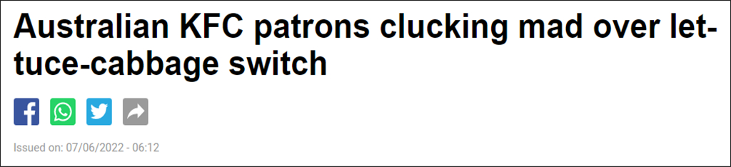 不過,雖然自己抱怨生菜價格過高,但澳大利亞消費者對肯德基將產品中的部分生菜換成捲心菜還是心有不滿。據法新社稱,澳大利亞的肯德基顧客們表示,吃“改良”後的食品還不如“吮指好(finger lickin’ good)”。這句“finger lickin’ good”是肯德基的一句經典廣告詞,因為新冠肺炎疫情,肯德基在2020年停用了這一廣告詞。