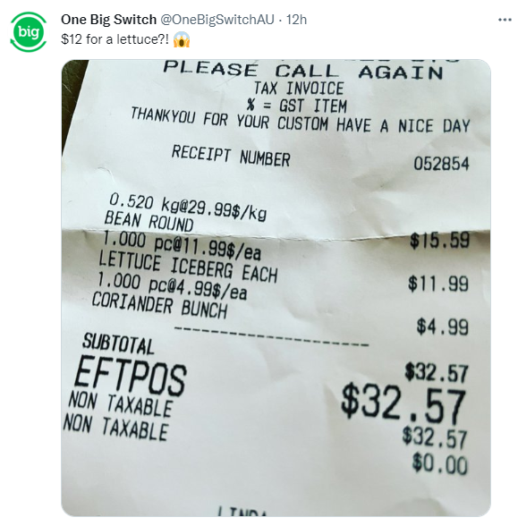 澳大利亞消費者團體One Big Switch7日在推特上分享了一張結賬單,震驚表示:“一顆生菜12澳元?!”
