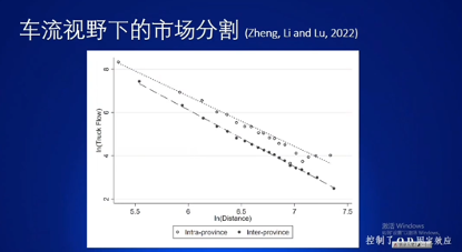 我們和上海的一家大數據公司評駕科技合作,他們有交通部下轄的全國的貨車、客車的車流,我和李傑偉、鄭怡林以此評估了市場分割情況。結果就是:大家看車流的情況,橫軸就是任何兩個城市的距離,像上海到蘇州80公里,到南京300公里;縱軸就是兩個城市的車流。有兩條線,每一條線都是往右下角傾斜,就是説兩個城市距離越遠,車流越少。很好理解,因為距離遠的地方貿易成本高,大家經濟聯繫少一點,那麼這兩條線怎麼回事?上面的圓圈帶着點的線,代表這兩個城市在同一個省;下面是是黑點,就是代表不在同一個省。如果不在同一個省的話,車流總是小於同樣距離下兩個城市在同一個省。我們看兩個城市在不同的省,距離是200公里,他們車流相當於在同一個省內部相距302公里的一組城市之間的車流,換句話説,我們今天的省際邊界可以把兩個城市之間的距離拉開接近100公里。根據我們的估計,這個情況比上世紀90年代中期好多了。但是,我必須遺憾地告訴大家,一直到今天,這種市場分割的狀態僅略好於其他研究裏面看到的歐洲國家和國家之間的市場分割狀態。這樣大家可以理解為什麼中央要講加快建設全國統一大市場。