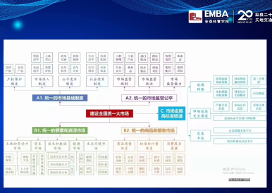 理解了這些東西以後,大家再去看前一階段中共中央國務院發佈的關於加快建設全國統一大市場的指導意見就一目瞭然。我借了網上的圖(見上圖)——非常抱歉,我們沒有辦法找到源頭了,這個圖很簡明扼要。現在統一大市場是分三大方面、五個小方面,首先是統一的市場制度,包括統一的市場基礎的制度、統一的市場監管公平;第二是統一的市場的商品和服務市場,包括要素市場;第三是市場設施要高標準,全國連通。
