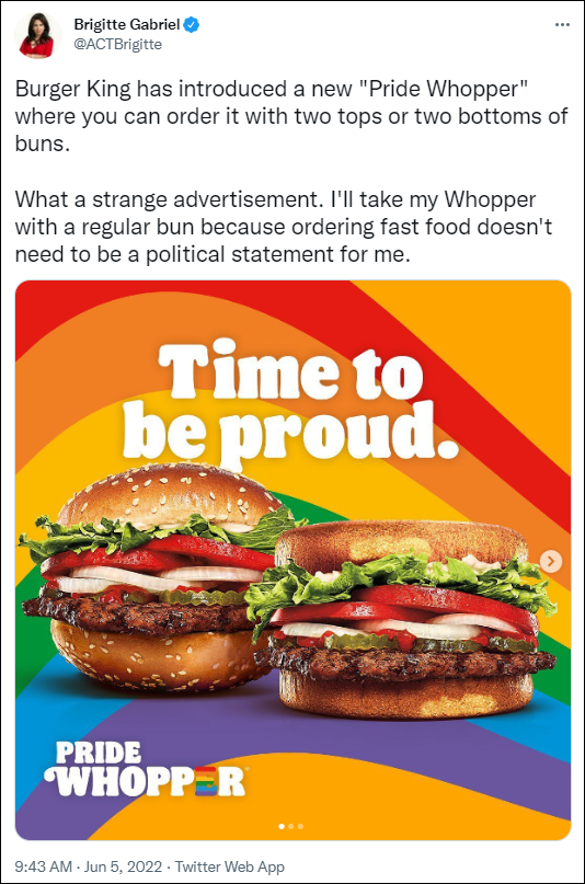 其中,美國保守派作家布里吉特·加布裏埃爾(Brigitte Gabriel)還在推特上直言,“這是一個奇怪的廣告。我只會點普通款小圓麪包的漢堡,因為點快餐對我來説不需要成為一種政治聲明。”