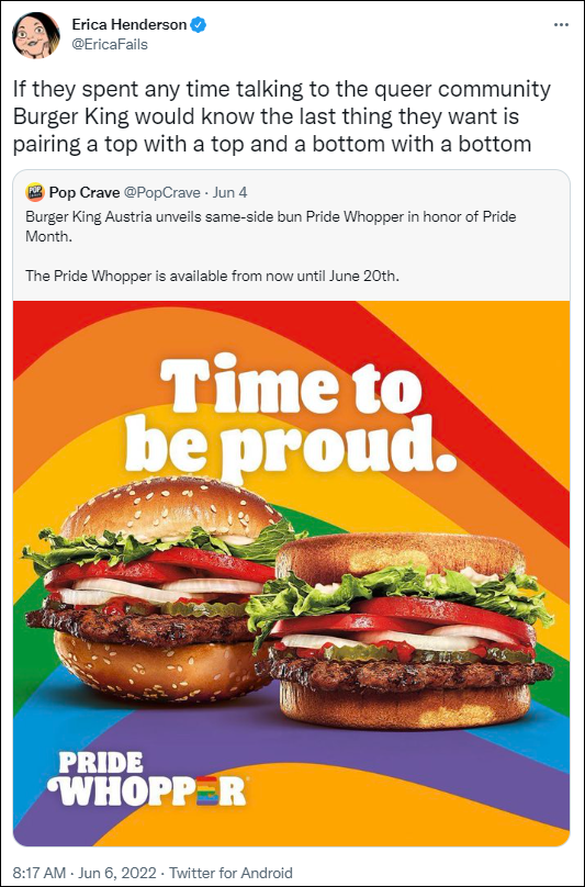 據美國“Gizmodo”網站指出,雖然漢堡王的意圖是好的,但它完全沒有偏離了目標,因為它在一個漢堡上“強加了性暗示”。正如漫畫藝術家埃裏卡·亨德森(Erica Henderson)在推特上表示:“如果漢堡王花時間和酷兒羣體(性少數羣體)交談,漢堡王就會知道,他們最不想看到的就是頂部配頂部,底部配底部。”