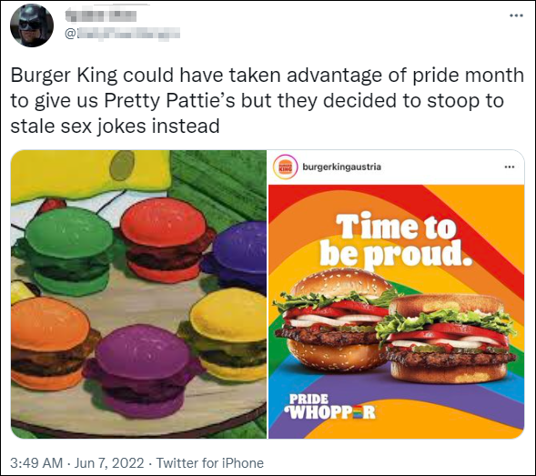 一位網民也評論道:“漢堡王本可以趁這個驕傲月給我們推出彩色漢堡,但他們卻決定開陳腐的性玩笑。”