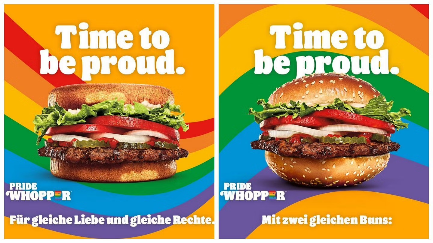 根據奧地利漢堡王在Instagram上解釋稱,在每個“驕傲皇堡”上使用“兩片相等的麪包”的想法,代表了“平等的愛和平等的權利”。