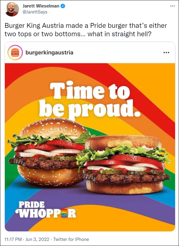 奈飛(Netflix)經理傑勒特·威塞爾曼(Jarett Wieselman)3日在推特上質問道:“奧地利漢堡王做了一款‘驕傲’皇堡,不是兩個頂部就是兩個底部……到底是什麼鬼?”